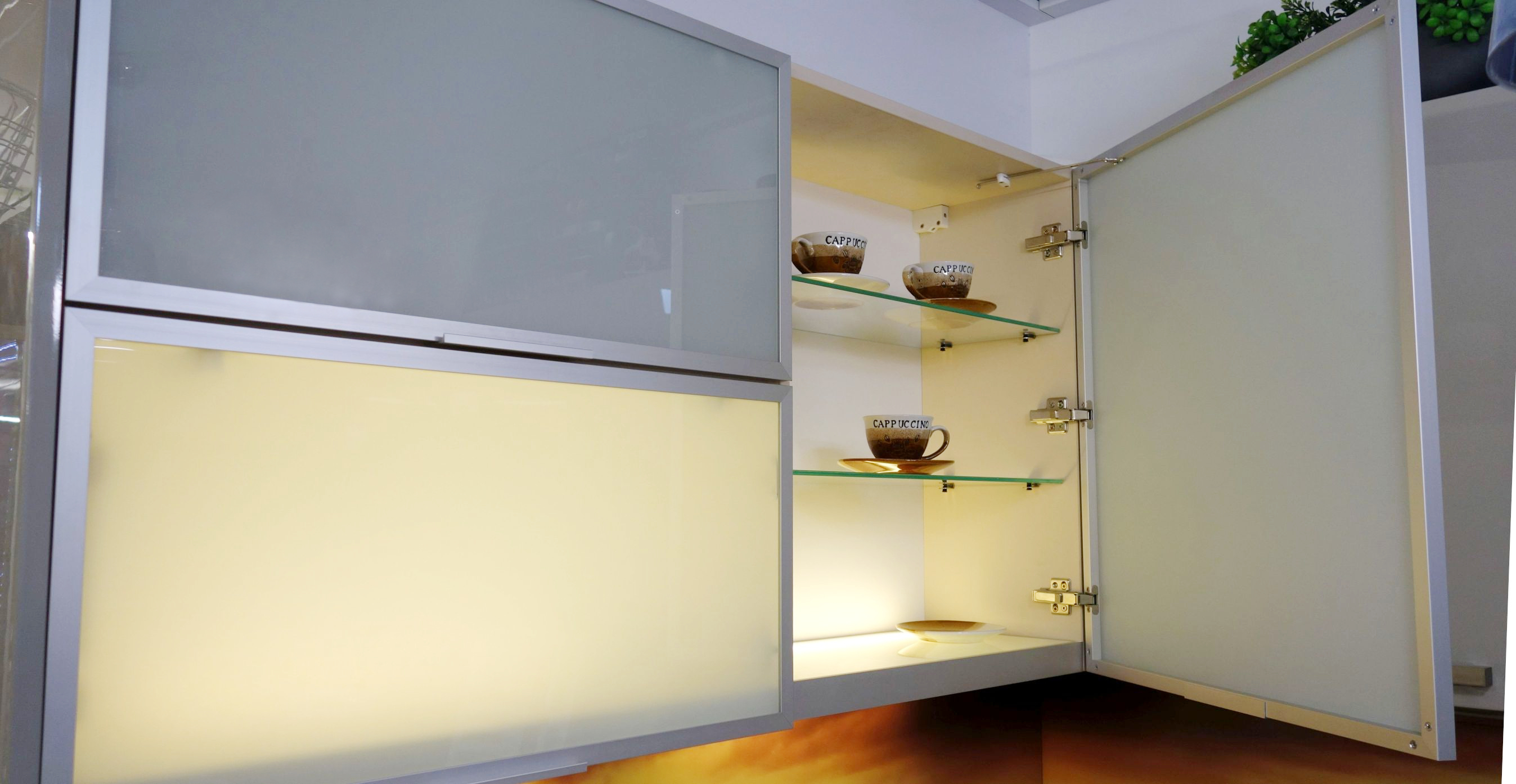 In the picture there are fronts with F1 profile. The base of the cabinet is made of an LED shelf (it's also one of our products). The insert in the doors is LACOMAT glass. It is perfect for LED lights - the colour of the glass changes when the inside is illuminated.
