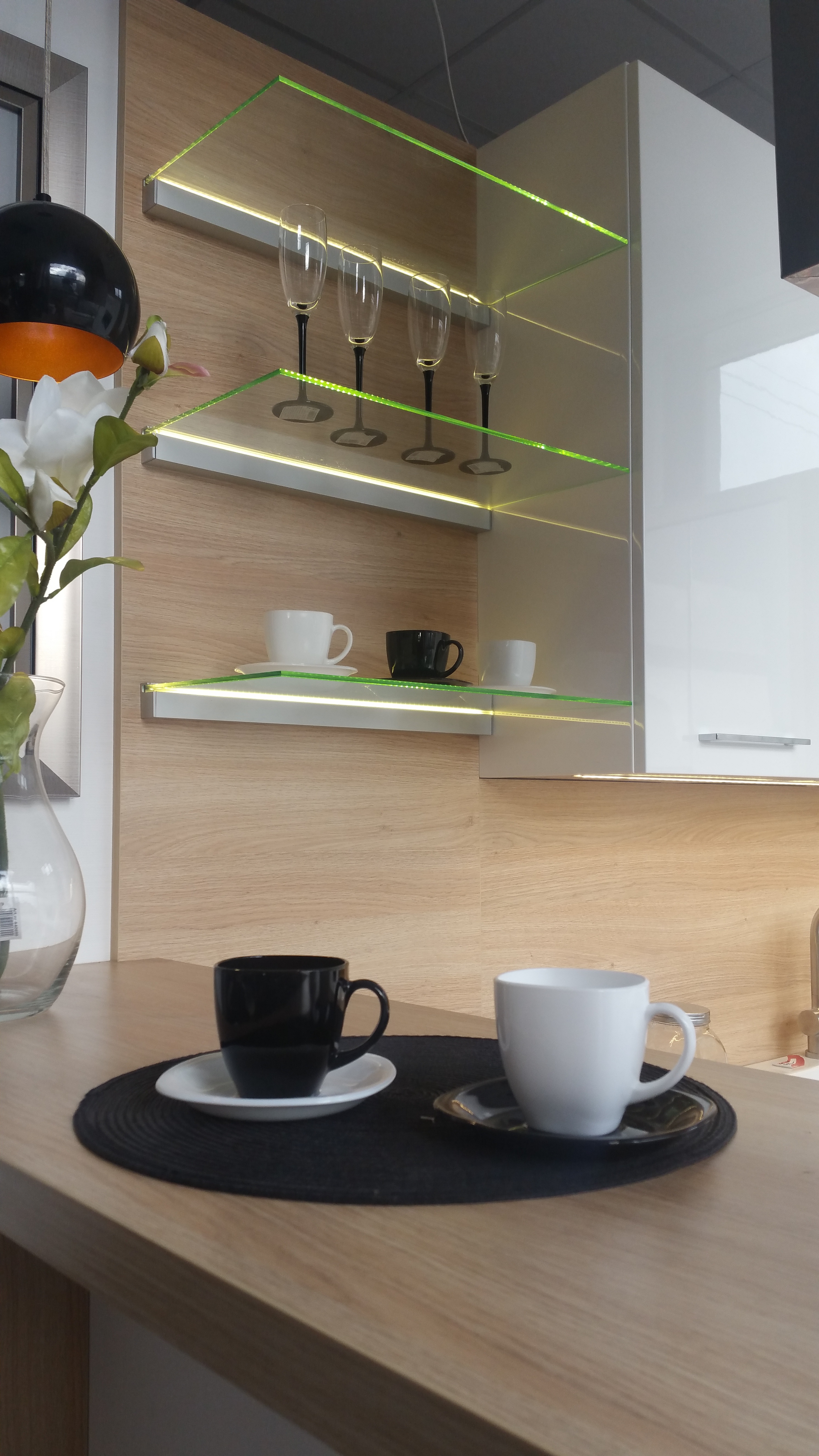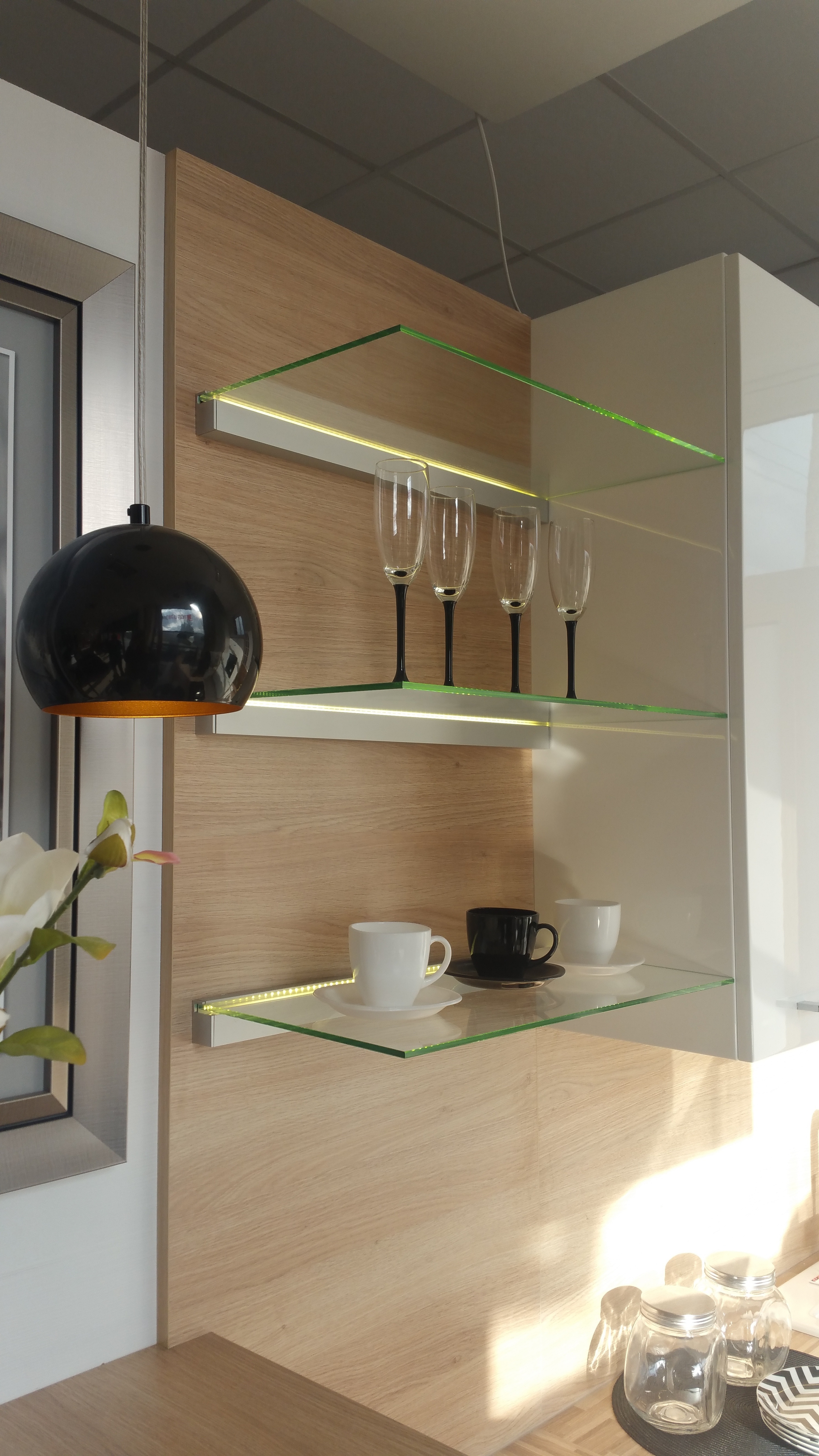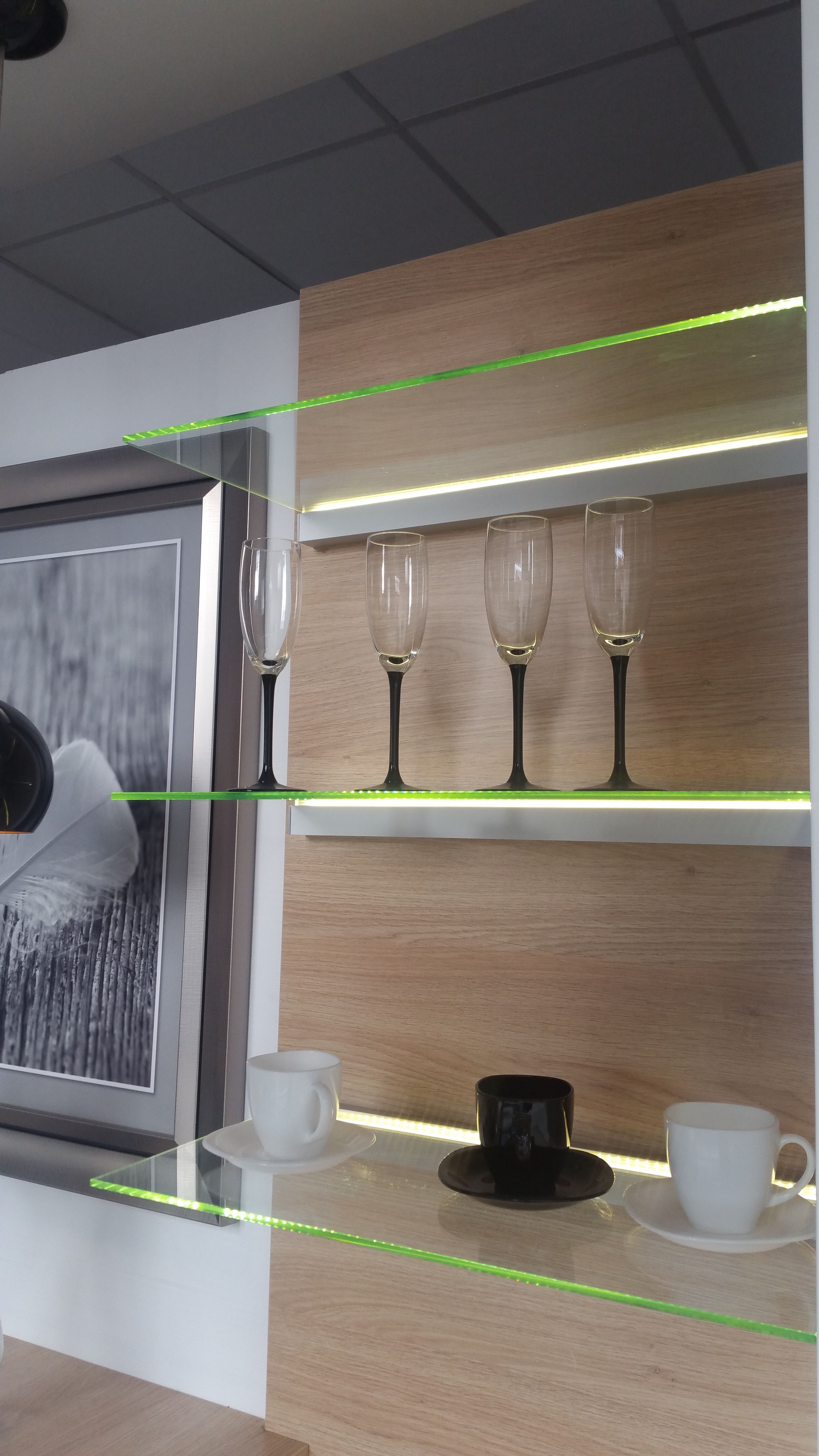 Półki szklane ze wspornikiem WS K,  z wykorzystaniem dodatkowego oświetlenia LED.